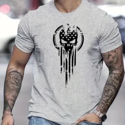 Men’s Summer Loose Size 100% Cotton Skull Print Casual Slim Fit Round Neck Short Sleeve T-shirt Top O-neck Pactwork Casual T