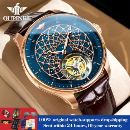OUPINKE 8002 Watch Man Hollow Deep Waterproof Tourbillon Mechanical Watch For Men Synthetic Sapphire Mirror Fashion Hand Clock