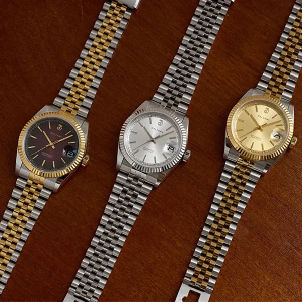 Bracelet: 316L Stainless Steel, 5 Piece Links Jubilee Style Bracelet, Two Tone(gold & Burgundy dial)/Steel Color(silver dial)