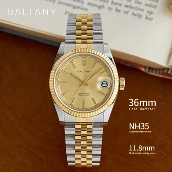 Baltany Retro 36mm Gold Watch Stainless Steel Brushed Sapphire NH35 Automatic Mechanical Wristwatch Men reloj hombre S4084