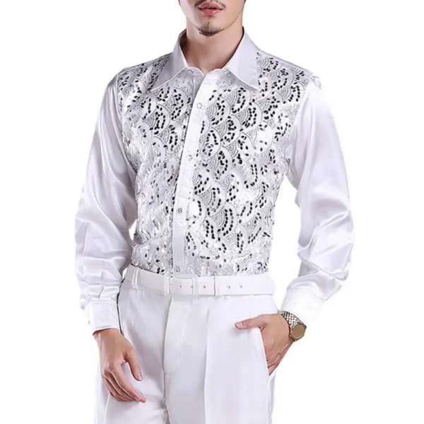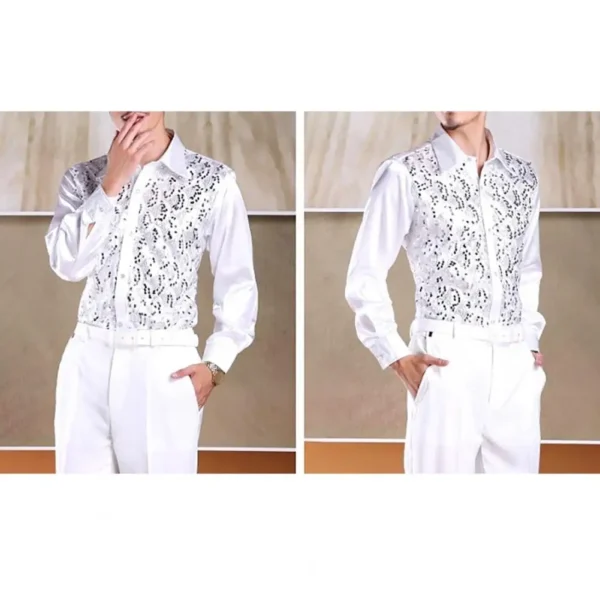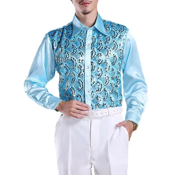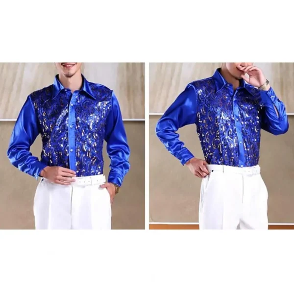 Formal Casual Shirt Tops Men’s Luxury Sequins Performance Shirt for Wedding Stage Formal Casual Wear Long Sleeve Single-breasted