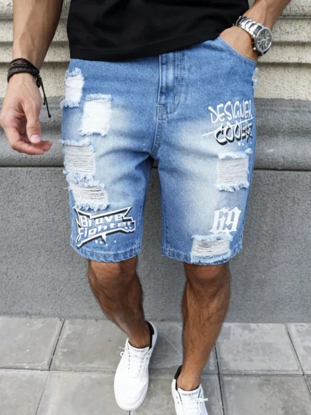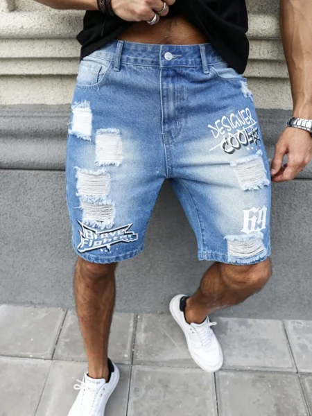 Men’s summer blue ripped printed denim shorts. Trendy ripped design. Stylish text prints.