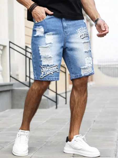 Men's summer blue ripped printed denim shorts. This is a trendy ripped – style item, featuring deliberately aged – looking rips in multiple places, adding a sense of casualness and fashion. It also has text and pattern prints, further enhancing its trendy nature. Denim shorts are a common men's wear item in summer. They are comfortable, breathable, and convenient for movement. Styles with such personalized elements are very popular among young men who pursue fashion and individuality.