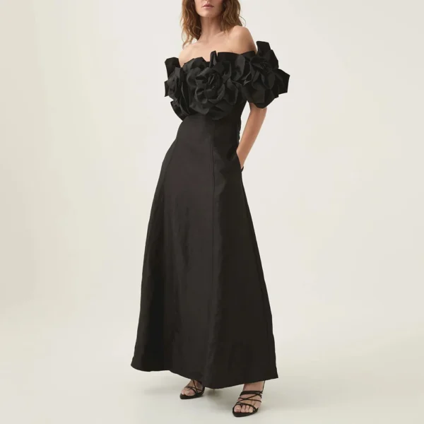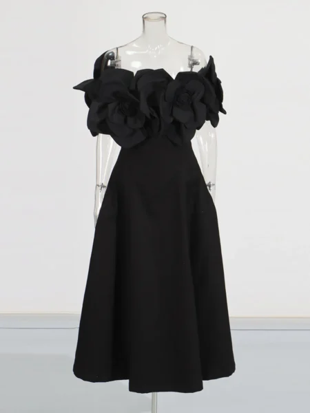 TWOTWINSTYLE Solid Fashion Midi Dresses for Women Slash Neck Sleeveless Patchwork 3D Flower Tunic Dress Female Autumn Clothing